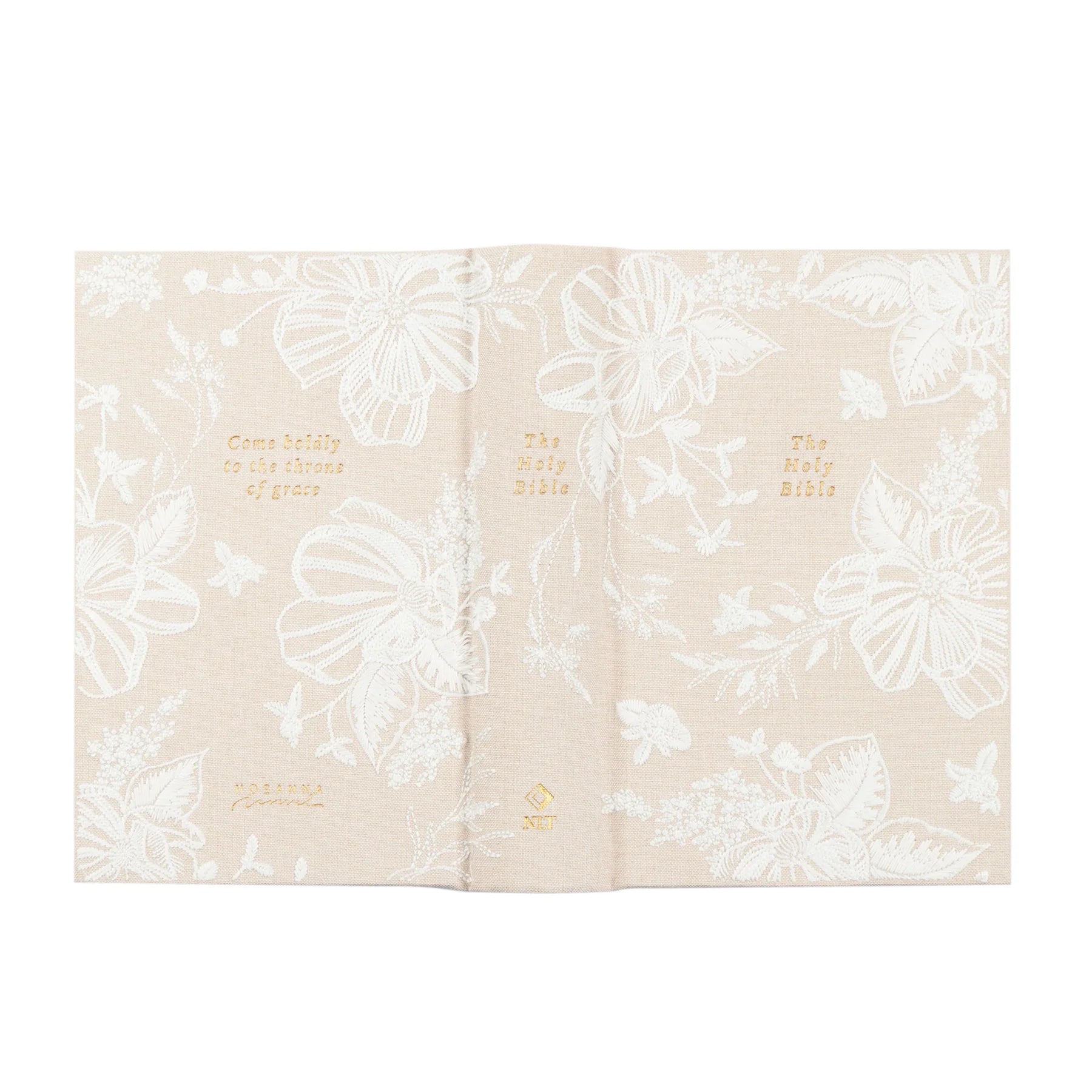 Beige fabric Bible with white floral patterns and gold text on a white background