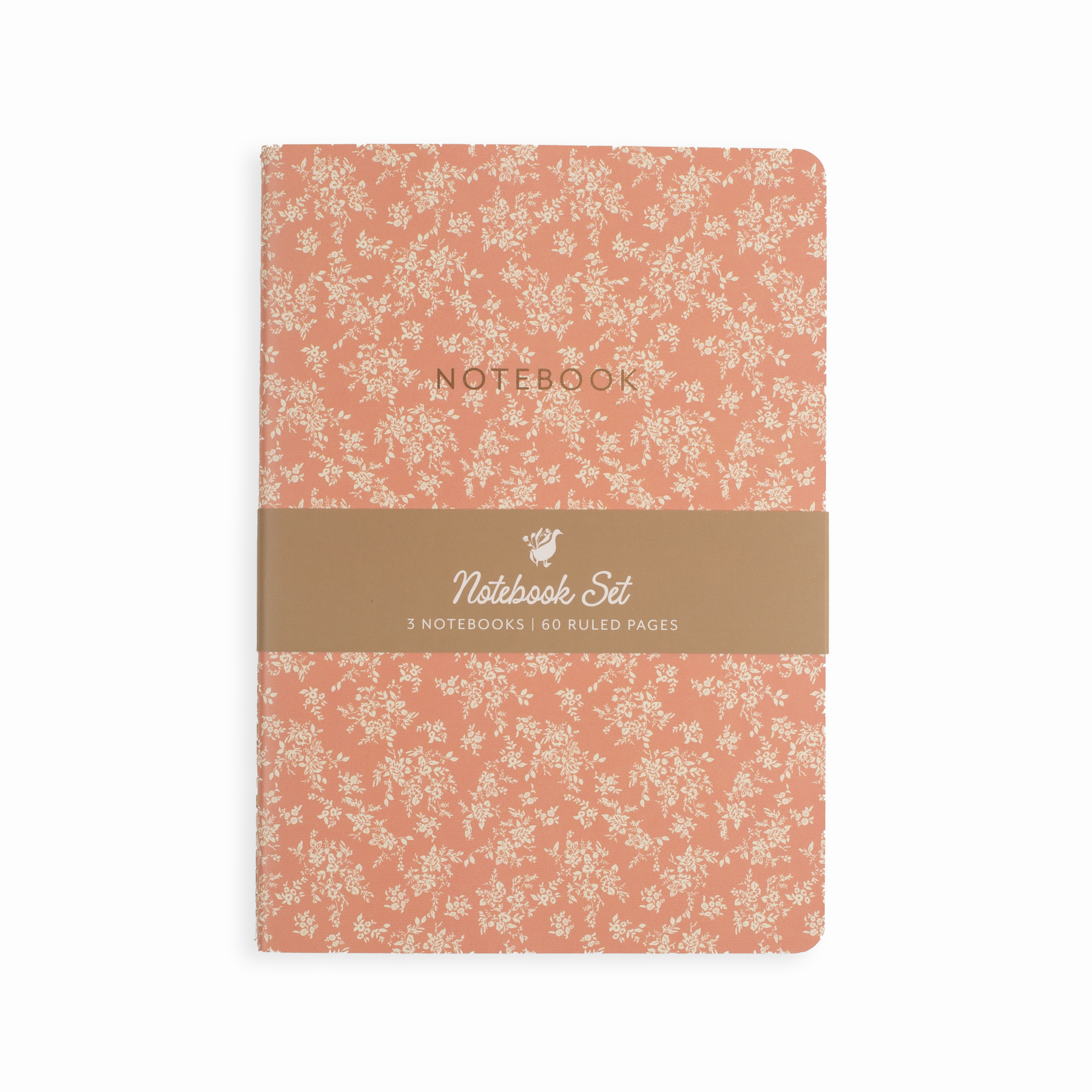 Three notebooks with floral and nature-themed designs on a light beige background.
